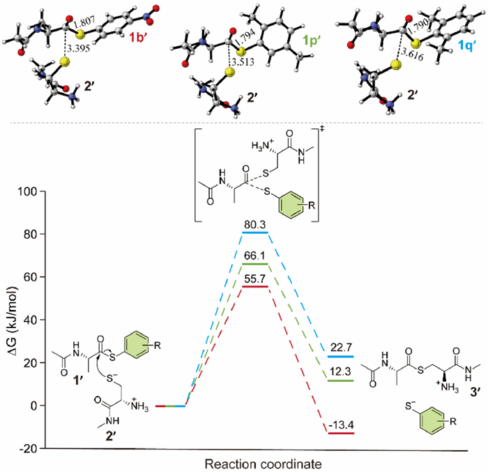 Another notable observation is the unusual change in the ligation activity of 1a and 1q, whose corresponding arylthiols have pKa values at the two extremes of the pKa range (Fig. 2, highlighted in yellow). To uncover the reason behind this variation, we calculated the free energy profiles corresponding to the NCL reactions of arylthioesters 1b, 1p, and 1q using the density functional theory (DFT) method. Since the widely accepted mechanism for NCL involves two steps. A reversible transthioesterification step and a subsequent intramolecular S-N acyl transfer [40], and the second step is consistent for all variants, our investigation focused only on the transthioesterification step. To simplify this investigation [40], the structures of the three arylthioesters, 1b, 1p, and 1q, were reduced to Ac-Ala-S-Ph(4-NO2) (1b’), Ac-Ala-S-Ph(2,5-diCH3) (1p’), and Ac-Ala-S-Ph(2,6-diCH3) (1q’) for the calculations. Similarly, the structure of peptide fragment 2 was reduced to H—Cys-NHMe 2′ (Fig. 3).