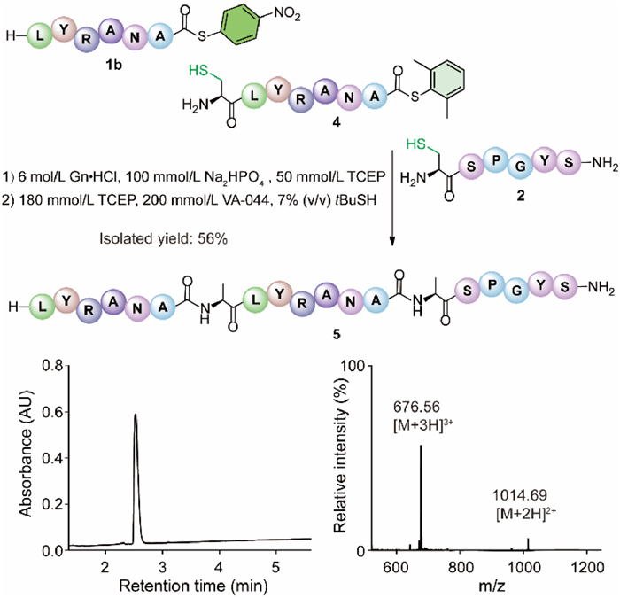| Fig. 4. Feasibility test for the envisioned one-pot protein synthesis approach by leveraging the differences in arylthioester ligation activity conferred by C-terminal Ala-S-Ph(4-NO2) and Ala-S-Ph(2,6-diCH3). The lower portion shows the LC-MS characterization of the artificial peptide 5, which has calculated m/z values of [M + 2H]2+, 1014.52 and [M + 3H]3+, 676.69. | |