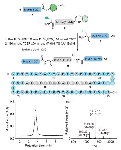 Finally, we demonstrated the robustness of this one-pot method through the synthesis of a real-world protein. Consistent with the primary focus of our laboratory, we chose the unglycosylated form of human mucin-like protein 1 9, consisting of 70 amino acids and containing a Cys69 to Ser mutation, as the synthetic target [41-43]. In its natural form, this protein bears various glycans on its Ser and Thr residues. The method for the synthesis of 9 closely mirrored that for 6 (Fig. 5). After the iterative ligation steps involving fragments 6,7, and 8, direct one-pot desulfurization and HPLC purification of the reaction mixture yielded the desired product 9 with a pleasing 32% isolated yield.