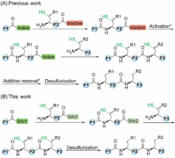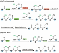 | Scheme 1. One-pot protein synthesis. (A) Conventional approach. (B) Streamlined approach developed in this study. P1, P2 and P3 represent peptides, R1 and R2 denote amino acid side chains, and Ar1 and Ar2 represent aryl groups. * indicates potential additional steps. | |