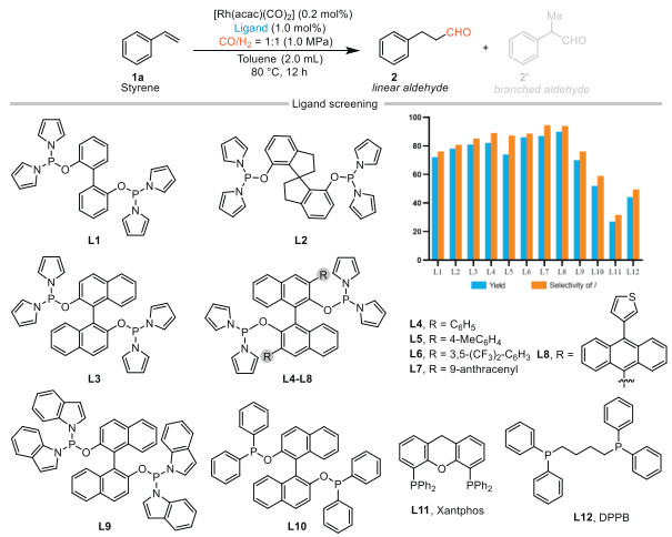 We started our study with styrene 1a as the model substrate to screen various ligands (Table 1). Inspired by previous works, we prepared a series of bidentate phosphorus ligands and tested their abilities to control the Rh-catalyzed hydroformylation with linear selectivity. To our delight, L1 yielded the linear product benzenepropanal 2 in 72% yield with 76:23 linear to branched ratio (l/b). The moderate regioselectivity indicated that the high π-acidity of the ligand probably plays a critical role in favoring linear product formation, suggesting that the pyrrole moiety enhances regioselectivity. Next, we modified the ligand's structure by replacing the biphenyl group with a naphthalene moiety (See details in Supporting information) [40]. This alteration slightly improved both the yield and regioselectivity, likely due to the increased rigidity of the naphthalene backbone (L3). However, when we changed the naphthalene skeleton with spiroindene, the results were not satisfactory (L2). Next, we selected L3 as the promising ligand and modified the ortho positions with diverse substitutes. Substituting the ortho position with a phenyl group (L4) produced the comparable performance to L3. However, when 4-methyl benzene group was installed on the naphthalene, both the yield and regioselectivity decreased slightly (L5). In contrast, substituting trifluoromethyl at the ortho position of the benzene ring increased the yield, although the selectivity remained similar (L6). These findings suggest that the electronic properties of substituents at the ortho position of the aromatic substitutes have minimal impact on regioselectivity. Subsequently, we designed and synthesized ligands L7 and L8, which possess significant steric hindrance. Surprisingly, these ligands led to a notable improvement in both yield and regioselectivity. However, when the pyrrole group was replaced with the indole moiety, the reaction exhibited lower efficiency (L9). Moreover, the phosphinite ligand L10 exhibited poor selectivity as well. Notably, commercially available ligands such as Xantphos (L11) and DPPB (L12), provided poor regioselectivities.