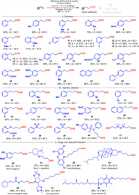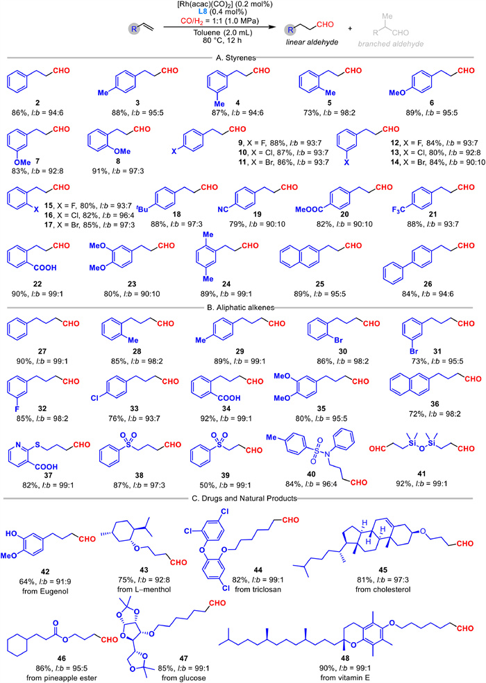 | Scheme 2. Scope of substrate. (A) Scope of styrenes. (B) Scope of aliphatic alkenes. (C) Drugs and natural products. Reactions were performed with alkenes (0.5 mmol), Rh(acac)(CO)2 (0.2 mol%) in toluene (2.0 mL). Regioselectivity were determined with GC–MS and 1H NMR analysis using the crude reaction mixture. Isolated yield. | |