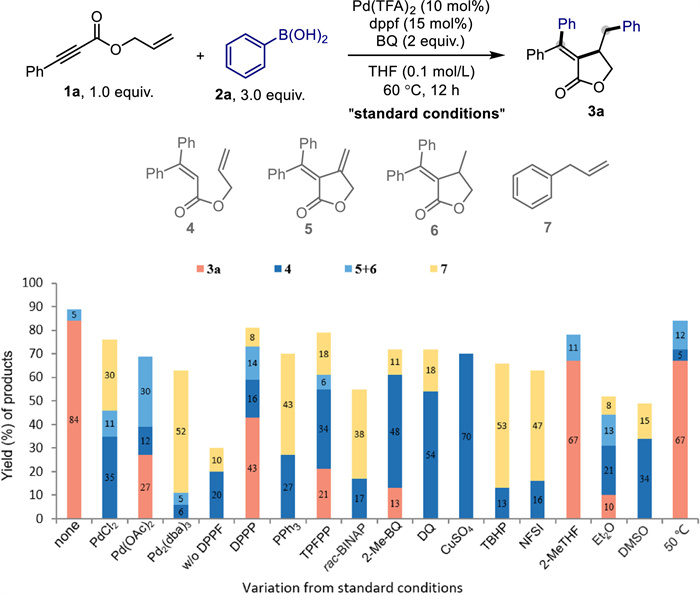 | Fig. 1. Optimization of the reaction conditions. Standard conditions: 1a (0.2 mmol), 2a (0.6 mmol), Pd(TFA)2 (10 mol%), DPPF (15 mol%), BQ (200 mol%), THF (2 mL), 12 h. The ratio of products were determined by GC–MS with n-dodecane as the internal standard except for isolated yield under standard conditions. TPFPP = tris(pentafluorophenyl)phosphine, BQ = 1, 4-benzoquinone, 2-Me-BQ = p-toluquinone, TBHP = tert‑butyl hydroperoxide, 2-MeTHF = 2-methyltetrahydrofuran. | |