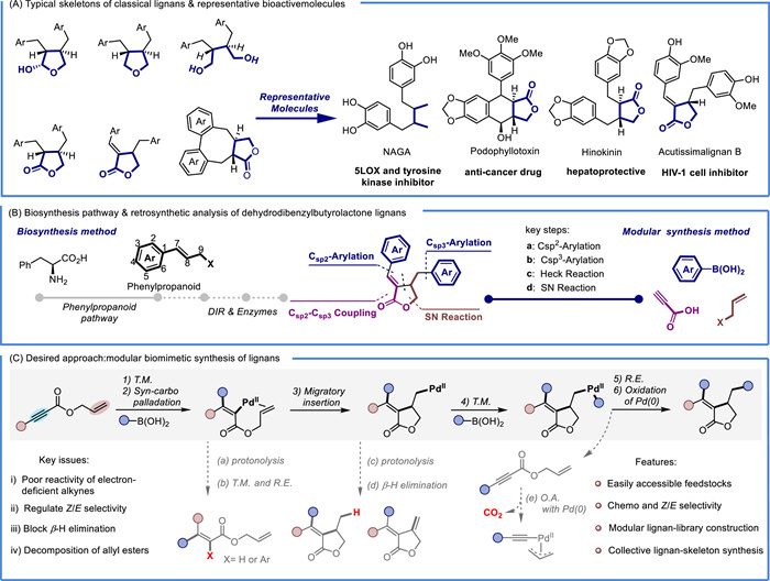 From 1981 to 2019, more than one-third of the small-molecule drugs approved by the FDA were derived from natural products and their derivatives [1]. Expanding natural product scaffolds to elucidate structure-activity relationships is essential for enhancing drug properties and speeding up drug discovery, which has been intriguing and sought after in organic synthesis [2–5]. Notably, lignans, plant-derived natural products with notable bioactivities, are commonly composed of phenylpropanoid (C6-C3 unit) dimers linked by the C8 carbon atom [6–9]. The diverse cyclization patterns, oxygenation states, and aromatic moiety substitutions of phenylpropanoid contribute to the structural variability of lignans, allowing for a wide range of bioactivities despite their modest size and complexity (Scheme 1A, left) [10–14]. A wide range of promising pharmacological activities, including antitumor, antiviral, anti-inflammatory, antimicrobial, antioxidant, antiallergic, antihypertensive, hepatoprotective, and sedative, have been discovered. For instance, NAGA extracted from Larrea tridentata, a traditional herb, functions as a 5-lipoxygenase and tyrosine kinase inhibitor [15]. Podophyllotoxin and its derivatives are utilized in cancer therapies [16]. Hinokinin, isolated from Pycnanthus angolensis, demonstrates significant apoptosis-inducing effects on human hepatoma cells [17]. Acutissimalignan B, derived from Phyllanthus acutissima, exhibits inhibitory properties on HIV-1 cells (Scheme 1A, right) [18].