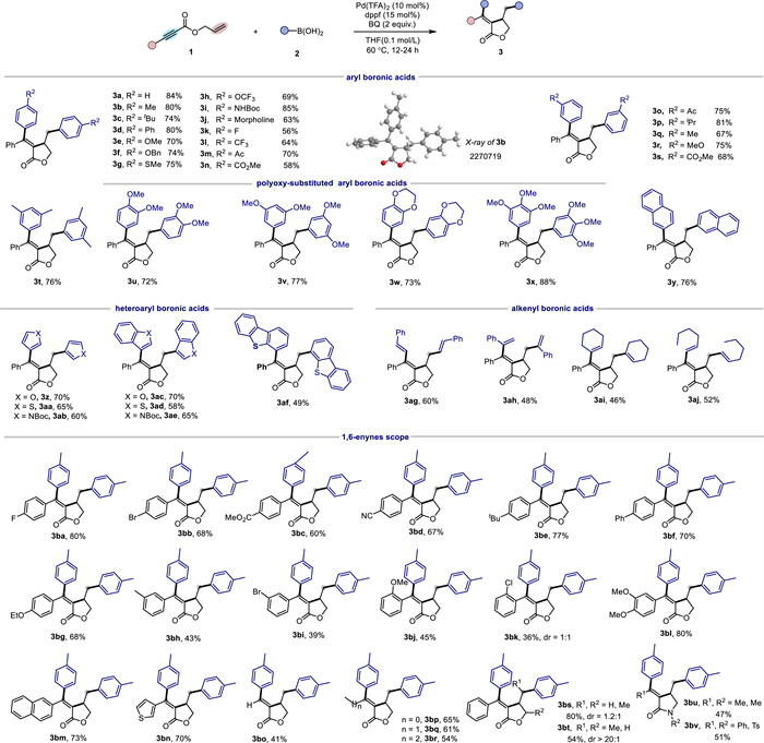 Considering the abovementioned challenges, we inferred that ligand control and oxidative regeneration of palladium(Ⅱ) species were crucial for achieving the envisioned domino sequence. To test our hypothesis, we explored reaction conditions with 1, 6-enyne esters 1a and phenylboronic acid 2a as model substrates. Unfortunately, initial screening did not yield the target product 3a; instead, two by-products 4 and 7 were observed, likely resulting from the protonolysis of Csp2-Pd species and the coupling between decomposed 1a and 2a (see Supporting information for more details). To our delight, we isolated 3a in 25% yield with the assistance of DPPP and benzoquinone, along with two new cyclic by-products 5 and 6 from the protonolysis and β-H elimination of Csp3-Pd species. Ultimately, we found that the combination of Pd(TFA)2 (10 mol%) as the catalyst, DPPF (15 mol%) as the ligand, and THF (0.1 mol/L) as the solvent resulted in efficient oxidative dicarbofunctionalization of 1, 6-enyne (Fig. 1). To summarize critical observations, our analysis revealed that the use of alternative palladium(Ⅱ) salts, such as PdCl2 and Pd(OAc)2, resulted in notably decreased yields, while palladium(0) precatalysts, like Pd2(dba)3, appeared to cause the decomposition of 1a, suggesting a potential link between the Lewis acidity of palladium and chemoselectivity. Variations in ligands, oxidants, solvents, and reaction temperature significantly impacted the outcome, with different choices leading to lower yields or altered chemoselectivity. The distinct behavior observed with benzoquinone (BQ) and p-toluquinone (2-MeBQ) suggested a possible coordination effect between quinones and palladium, highlighting the influence of steric effects on the catalytic cycle.