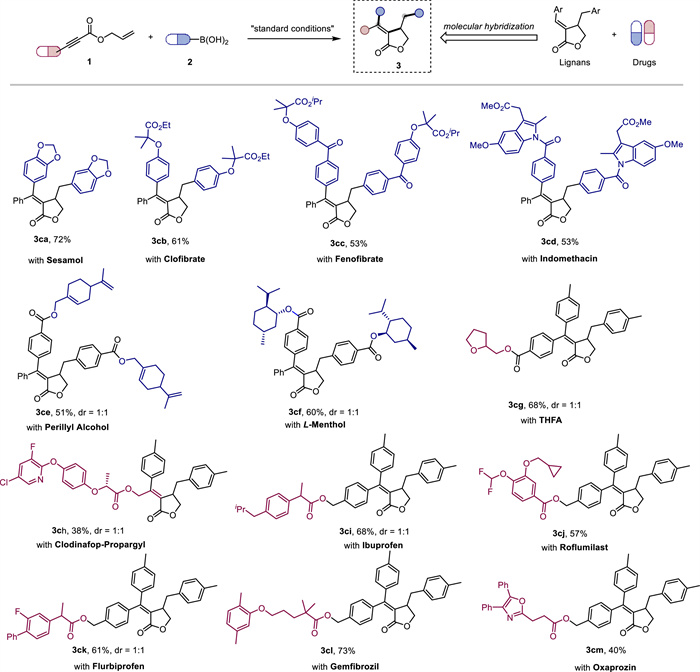 Molecular hybridization is a crucial and practical approach in drug design, combining various pharmacophore fragments to create a more potent bioactive molecule [49,50]. Inspired by the positive pharmacological effect of lignans and the diversity of building blocks, we explored the potential of our method for the modular molecular hybridization of lignans with natural products, biologically active compounds, and pharmaceutical agents (Scheme 3). Utilizing drug-derived arylboronic acids, a novel lignan skeleton incorporating two pharmacophore fragments was efficiently constructed. Notably, commercially available pharmaceuticals such as sesamol (3ca), clofibrate (3cb), fenofibrate (3cc), and indomethacin (3cd) fragments were successfully incorporated into γ-butyrolactone with 53%−72% yields. Perillyl alcohol (3ce), and l-menthol (3cf) were also demonstrated to hybridize with lignans seamlessly. Profiting from the convenient synthesis of 1, 6-enyne, pharmacodynamic moieties were successfully introduced into the non-aryl ring framework of lignans. Various drugs such as THFA (3cg), ibuprofen (3ci), roflumilast (3cj), flurbiprofen (3ck), gemfibrozil (3cl), and oxaprozin (3cm) were able to undergo formal molecule hybridization with lignans. Surprisingly, clodinafop-propargyl (3ch), an alkyl alkyne with multiple functional groups, including catalyst-poisoning pyridinyl, displayed effectiveness with moderate yields, highlighting the broad scope and good functional-group compatibility of the approach.