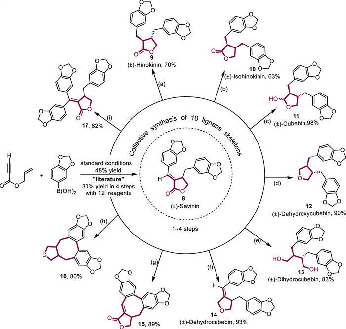 In addition to the high throughput screening of aromatic moiety substitutions in the phenylpropanoid unit, the collective synthesis of lignan skeletons with different cyclization patterns and oxygenation states is crucial in discovering lignan-based drugs. As such, we intended to realize the divergent synthesis of lignan skeletons to showcase the potential of our methodology in drug optimization studies (Scheme 4). With 3, 4-(methylenedioxy)phenylboronic acid as the template aryl source, (rac)-savinin (8) was obtained in a single operation with 48% yield, which, to the best of our knowledge, was the most concise process in the literature [51]. The diastereodivergent reduction of the double bond in 8 yielded (rac)-hinokinin 9 and (rac)-isohinokinin 10, respectively, with the assistance of Ni/NaBH4 and Mg/MeOH, allowing for the synthesis of unnatural diastereoselective lignans. Furthermore, the double bond of (rac)-savinin 8 underwent an oxidative Heck reaction to achieve Csp2H arylation, forming 17, a lignan skeleton with triaryl groups. Subsequent treatment with various reagents led to the presence of (rac)-cubebin 11, (rac)-dehydroxycubebin 12, (rac)-dihydrocubebin 13, and (rac)-dehydrocubebin 14 through the selective reduction of the ester moiety in (rac)-hinokinin. Dibenzocyclooctadiene lignans 15 and 16 could be rapidly constructed by oxidative coupling of aromatic rings.
