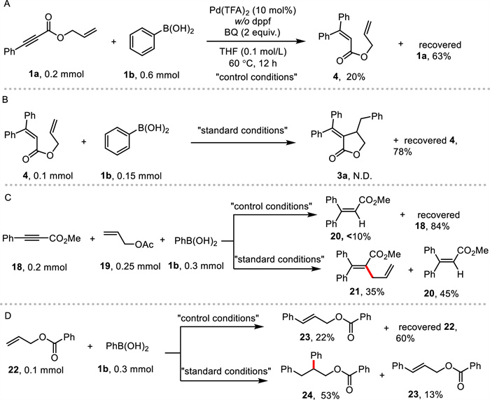 To elucidate the mechanism and selectivity-origin of the reaction, a series of experiments were conducted (Scheme 5). Initially, in the absence of DPPF, only non-cyclic product 4 was obtained (Scheme 5A). Further experiments revealed that 4 was not an intermediate to the target compound 3 (Scheme 5B). Methylphenylpropynoate 18, allyl acetate 19, and phenylboronic acid 1b were subjected to both "control conditions" and "standard conditions." Results indicated that in the absence of DPPF, the migration and insertion of the triple bond into the Ar-Pd(Ⅱ) species was difficult, providing a few products 20. However, with DPPF, a coupling product between the Csp2-Pd species and alkene 19 was observed, yielding 21 in 35% (Scheme 5C). Consequently, DPPF could accelerate the migration and insertion of double bonds into the Csp2-Pd species and partially inhibit the protonolysis of the Csp2-Pd species. Subsequently, the impact of the ligand on the reduction and elimination of the Csp3-Pd-Ar species was explored (Scheme 5D). In the absence of DPPF, only the oxidative-Heck-type product 23 was detected in 22% yields, which indicated the Csp3-Pd species would rapidly undergo β-H elimination, making selective transmetalation and reductive elimination unfeasible. Under standard conditions, diarylation product 24 was obtained with a 53% yield, highlighting the importance of DPPF in the reductive elimination of the Csp3-Pd-Ar species.