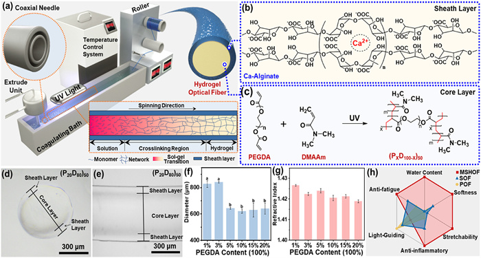 | Fig. 1. Wet spinning process and characterization of MSHOF. (a) Schematic diagram of integrated dynamic wet spinning of MSHOF. The chemical reactions of the sheath layer (b) and core layer (c) during spinning. (d, e) The cross-sectional and side-view optical images of (P20D80)90 in deionized water. (f) Average diameter of MSHOFs. (g) Refractive index of core spinning solutions in liquid phase. (h) A rough comparison between the MSHOF, SOF and POF. Data are presented as mean ± standard deviation (SD) (n = 5). | |
