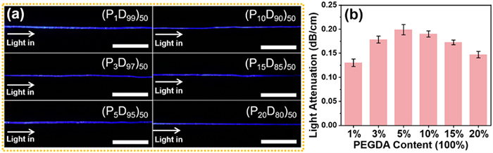 | Fig. 2. Light propagation through the MSHOF. (a) Photos of light propagation through different MSHOF with blue light (λ = 472 nm). Scale bar: 3 cm. (b) Light attenuation calculated based on the light scattering intensity of the MSHOF from above images. Data are presented as mean ± SD (n = 5). | |