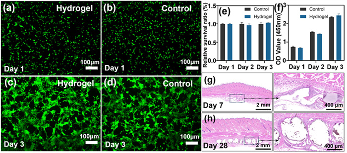 | Fig. 4. The biocompatibility evaluation of MSHOF with tissues. The live/dead cell staining assay (a–d) and cell proliferation activity (e, f) of NIH-3T3 cells that co-cultured with MSHOF on day 1 and 3. Data are presented as mean ± SD (n = 5). Scale bar: 100 µm. (g, h) tissue section and staining after implantation of MSHOF into skin for 7 days and 1 month. Scale bars: 2 mm and 400 µm. | |