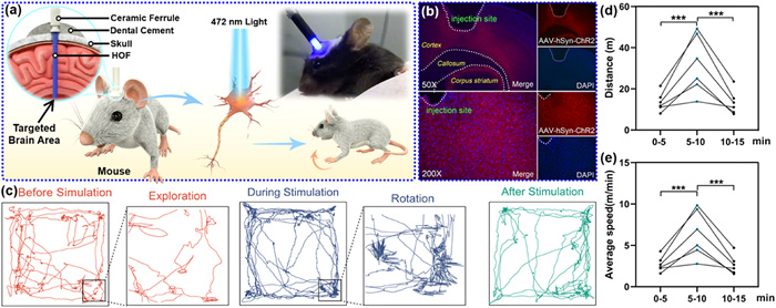 | Fig. 5. Application of photogenetic stimulation. (a) Construction of a motor cortex regulation model enables light and channelrhodopsin virus. (b) The target brain area for neural regulation. (c) Images of mouse movement behavior during light stimulation in field experiments. The movement distance (d) and average speed (e) of mice during optogenetic stimulation (pre-stimulus: 0–5 min, during stimulating: 5–10 min, post-stimulation: 10–15 min). Data were analyzed using ordinary t-test in Excel. ***P < 0.001. | |