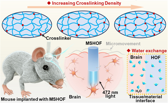As for the photomedicine in deep tissue, modulus is crucial to the long-term stable application of the implanted device. A large differentiation of mechanical modulus between brain/materials interface will cause foreign body reaction and inflammation, resulting in the proliferation of astrocytes and microglia, which could form glial scar tissues (thickness of about 100 µm) and cover the implant, thus seriously reducing the working stability of the implanted device [14]. Herein, the modulus-adaptive of the MSHOF is mainly divided into two aspects (Scheme 1). One is the regulation of crosslinking density, which will greatly affect the modulus of the hydrogel material. Another aspect is that when it is used as an implanted device, the MSHOF can adapt to absorb water molecules in the surrounding tissue, forming a similar state. By implanting with the MSHOF, shear micromovements of the brain caused by movement behavior of the organism can be tolerated by the low modulus of MSHOF, thus guaranteeing the safety of the biological tissue/material interface, achieving long-term modulation of neural activity.