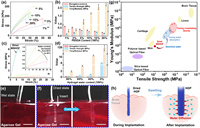 | Fig. 3. Mechanical properties of the MSHOF. (a) Tensile stress-strain curves of the MSHOF with different PEGDA contents. (b) Elongation, strength and modulus of MSHOF dependent on the PEGDA contents. (c, d) Tensile stress-strain curves and its derived elongation, strength and modulus of MSHOF insert in hydrogel with different water content. (e) Comparison of mechanical properties of our work with other optical fibers and human tissues. Images of implantation of dry (f) and wet (g) hydrogel fiber into agarose gel. Scale bar: 5 mm. (h) Schematic illustration of water absorption and expansion process of dried MSHOF in brain tissue. Data are presented as mean ± SD (n = 5). | |