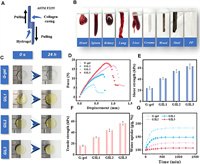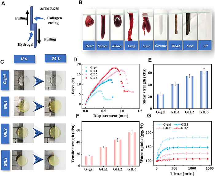 | Fig. 2. Performance of adhesion and mechanical characteristics of GIL hydrogels. (A) Conventional testing approach for evaluating adhesive strength properties in lap-shear through tension loading (ASTM F2255). (B) Adhesion of GIL2 to various biological tissues and inorganic materials. (C) Swelling conditions of G-gel, GIL1, GIL2 and GIL3 hydrogels in PBS buffer. (D) Force-displacement curves and (E) shear strength of G-gel, GIL1, GIL2 and GIL3 hydrogels. (F) Tensile strength and (G) Water uptake ratio of G-gel, GIL1, GIL2 and GIL3 hydrogels. Data are presented as the mean ± standard deviation (n = 3). | |