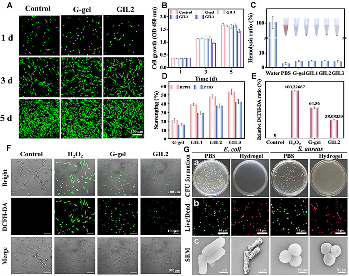 | Fig. 3. Evaluation of toxicity, hemolytic, and ROS scavenging activity of G-gel, GIL1, GIL2 and GIL3 hydrogels. (A) Calcein-AM/PI staining of HGFs post-incubation with hydrogels. Scale bar: 100 µm. (B) CCK-8 assay outcomes for cytotoxicity: absorbance results of G-gel, GIL1, GIL2, and GIL3 hydrogels on HGF cells. (C) Hemolysis tests for GIL series with corresponding photos inset. (D) DPPH and PTIO scavenging of G-gel, GIL1, GIL2 and GIL3 hydrogels. (E) Relative DCFH-DA fluorescence ratios of HGFs without H2O2 and hydrogel treatment (control), H2O2 treatment (H2O2), and H2O2 and hydrogel co-treatment (G-gel or GIL2). (F) Assessment of intracellular ROS reduction by hydrogels, using DCFH-DA (green fluorescence). Scale bar: 100 µm. (G) Assessment of GIL hydrogels’ antibacterial properties. (a) Images showing E. coli and S. aureus. (b) Typical CLSM photos of E. coli and S. aureus stained with SYTO9 (green) and PI (red) (scale bar: 10 µm). (c) SEM photographs of E. coli (scale bar: 1 µm) and S. aureus (scale bar: 500 nm) post-incubation with PBS and GIL2 hydrogels (1 mL, 1.0 × 108 CFU/mL). Data are presented as the mean ± standard deviation (n = 4). | |