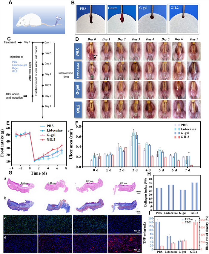 | Fig. 4. The oral ulcer healing of GIL hydrogels in rats. (A) Illustrative schematic showing the construction process for a hemostasis model in a rat tail. (B) Images depicting the results of hemostasis in rats post-treatment with various groups. (C) The progression of oral ulcer healing in rats over time following treatment with PBS, lidocaine, G-gel, and GIL2, respectively. (D) In vivo experimental procedure for the modeling and treatment of oral ulcers in rats (scale bar: 5 mm). (E) Food intake of rats during the experiment. (F) Analysis of ulcer wound area. (G) Histologic examination of areas of oral ulcers in rats: Photographic representation of H&E (a) and Masson (b) staining (scale bar: 1 mm), along with immunochemical staining for inflammatory markers TNF-α (c) and angiogenesis factors (CD31; d) (scale bar: 100 µm) at the ulcer region in rats after 7-day treatment with various materials. (H) Analysis of the collagen index quantitatively in stained image representations. (I) TNF-α and CD31 measured in tissues seven days after treatment. Data are presented as the mean ± standard deviation (n = 3). | |