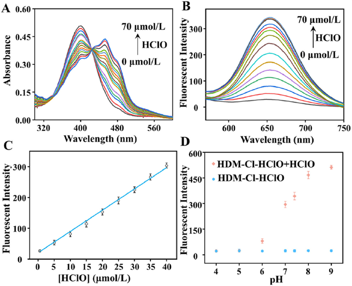| Fig. 1. Spectral properties of HDM-Cl-HClO for HClO. (A) The ultraviolet absorption spectrum and (B) fluorescence emission spectra of HDM-Cl-HClO toward HClO (0–70 µmol/L) for 5 s in PBS/DMSO (95:5) solution (pH 7.4, 10 mmol/L). (C) The linear relationship between the fluorescent signal of HDM-Cl-HClO to HClO (0–40 µmol/L). (D) The pH dependent fluorescence response of HDM-Cl-HClO to HClO. Data were presented as mean ± standard deviation (SD) (n = 3). | |