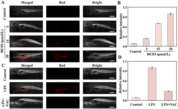 | Fig. 3. Imaging HClO in zebrafish. (A) Zebrafish were treated with no treatment and different levels of HClO (5, 15 and 30 µmol/L), and then imaged after incubation with HDM-Cl-HClO, respectively. (B) Relative fluorescent intensities in A. (C) Zebrafish were treated with no treatment, LPS, and LPS+NAC, and then imaged after incubation with the probe, respectively. (D) Relative fluorescent intensities in C. Data were presented as mean ± SD (n = 3). λex = 880 nm, λem = 630–690 nm. Scale bar: 500 µm. | |