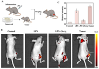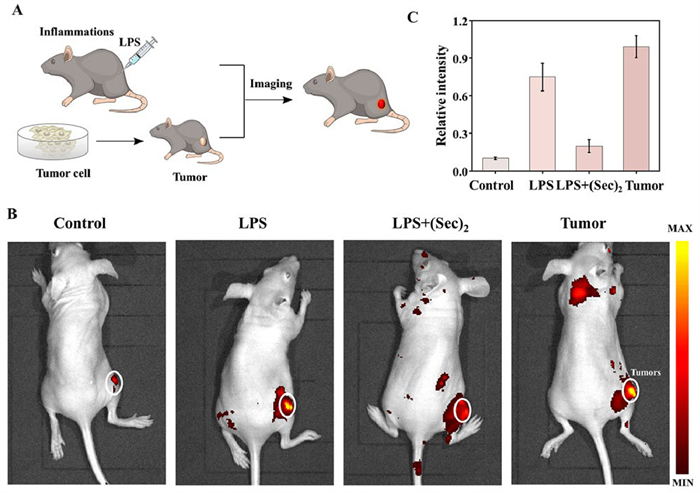 | Fig. 4. Fluorescence imaging of HClO in mice models of inflammation and tumor. (A) Schematic of inflammation and tumor mouse imaging. (B) Imaging of HClO in mice models of inflammation and tumor. Control group: healthy BALB/C mice; LPS group: LPS-induced inflammatory mice; LPS+(Sec)2 group: (Sec)2-treated the inflammatory mice; tumor group: tumor-bearing mice. (C) Relative fluorescent intensities in B. Data were presented as mean ± SD (n = 3). λex = 490 nm, λem = 630–690 nm. | |