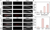 Considering the ability of HDM-Cl-HClO to detect changes in HClO levels at the cellular level, we set out to investigate its feasibility for HClO detection in living organisms. Zebrafish is an ideal animal model for imaging studies in living vertebrates due to its small size, rapid reproduction cycle, ease of handling, and excellent light transmission [43]. As shown in Figs. 3A and B, when the zebrafish were treated with the probe alone, we only captured a weak fluorescent response. However, we first treated zebrafish with 5 µmol/L HClO and subsequently co-incubated with the probe for 20 min, we observed a significant enhancement of red fluorescence, which confirmed the effectiveness of the probe in HClO detection. Next, we introduced different concentrations of HClO (15 and 30 µmol/L) and imaged the zebrafish after treatment with the probe again, and found that the red fluorescence signal was enhanced as the concentration of HClO elevated, which further demonstrated the potential of the probe’s application in monitoring changes in HClO levels within biological organisms. Given that HDM-Cl-HClO could achieve the detection of exogenous HClO in zebrafish, we further investigated its ability to detect endogenous HClO. Compared to the untreated group, the probe treated with LPS and co-incubated with HClO showed a significantly enhancement in red fluorescence signal (Figs. 3C and D). In contrast, the red fluorescent signal was weakened by the addition of NAC treatment, suggesting that the addition of NAC had an inhibitory effect on HClO levels. Together, these experimental results indicated that the probe possessed significant application in detecting the fluctuation of HClO levels in organisms.
