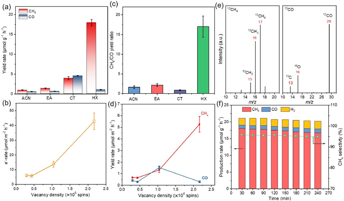 | Fig. 2. (a) Production rates of CH4 and CO. (b) Relationship between Br vacancy quasi-density and the surface area-normalized electron consumption rate. (c) The ratio of CH4/CO production rate. (d) Relationship between Br vacancy quasi-density and the surface area-normalized production rate of CH4 and CO. (e) 13CH4 and 13CO mass spectra for 13CO2 photocatalytic reduction on CsPbBr3—HX. (f) Stability test of CsPbBr3—HX at 150 ℃ under 3 sun irradiation. | |