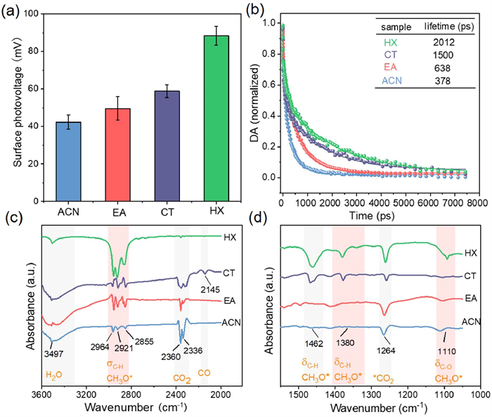| Fig. 3. (a) Surface photovoltage plots. (b) Transient absorption spectroscopy curves. In-situ DRIFT spectra of CsPbBr3 prepared with different solvents: Wavelength range of 1810–3600 cm-1 (c), and 1000–1550 cm-1 (d). Test process: Before test, the reaction cell was purged with Ar at a flow rate of 30 sccm and heated at 150 ℃ for 20 min. Then, the gas input was switched to CO2 and H2O vapor at a flow rate of 5 sccm. A background spectrum was collected after a 15 min equilibrium. The light was then turned on and the in-situ spectra after 20 min equilibrium were recorded. | |