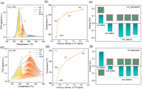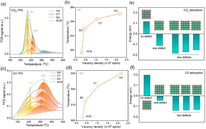 | Fig. 4. (a) CO2-TPD and (b) the change of adsorption temperature at P2 desorption peaks for CO2-TPD. (c) CO-TPD and (d) the change of adsorption temperature at P2′ desorption peaks for CO-TPD. (e) CO2 and (f) CO adsorption energy of CsPbBr3 with different number of defects. | |