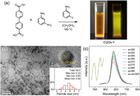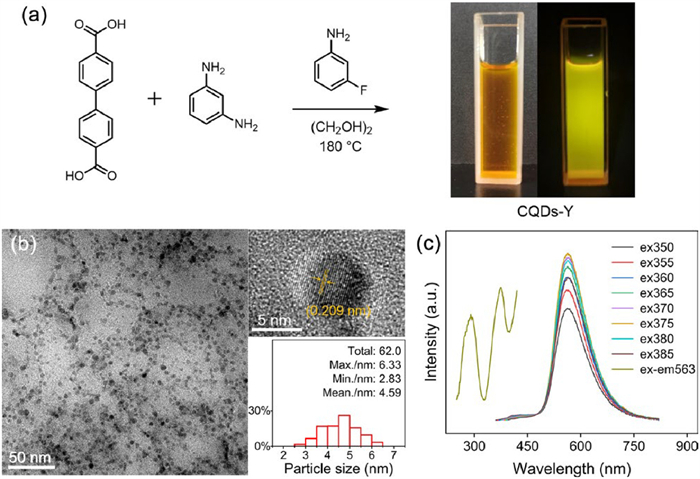| Fig. 1. (a) Synthesis route and photographs of CQDs-Y under ambient light and 365 nm UV light. (b) Transmission electron microscopy (TEM), high-resolution TEM (HR-TEM) images, and particle size distribution of CQDs-Y. (c) Fluorescence (FL) emission spectra of CQDs-Y at various excitation wavelengths, with an inset of FL excitation spectrum. | |