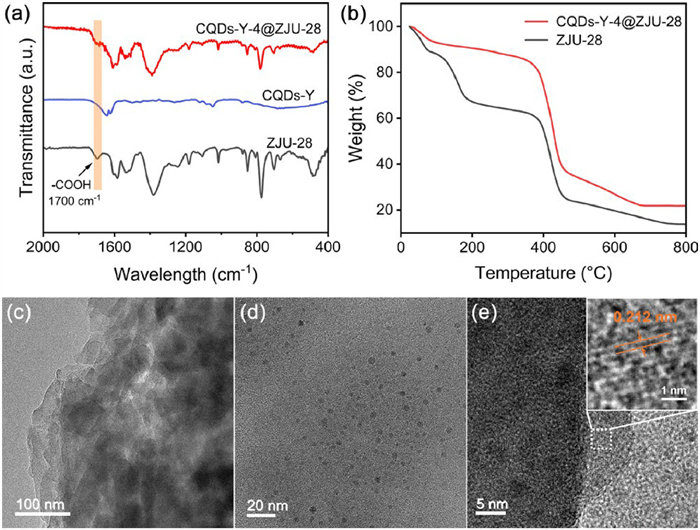 | Fig. 2. Structural and morphological characterization of CQDs-Y-4@ZJU-28. (a) FT-IR spectrum of CQDs-Y-4@ZJU-28. (b) TG analysis curve of ZJU-28 and CQDs-Y-4@ZJU-28. TEM of CQDs-Y-4@ZJU-28 at (c) 100 nm and (d) 20 nm, respectively. (e) HR-TEM of CQDs-Y-4@ZJU-28. | |