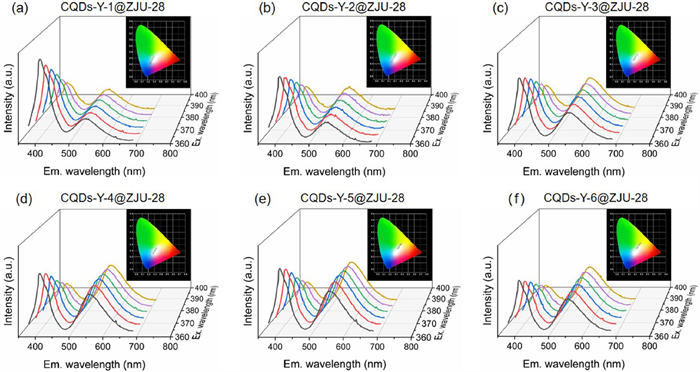 | Fig. 3. FL emission spectra at various excitation wavelengths, and corresponding CIE coordinates: (a) CQDs-Y-1@ZJU-28, (b) CQDs-Y-2@ZJU-28, (c) CQDs-Y-3@ZJU-28, (d) CQDs-Y-4@ZJU-28, (e) CQDs-Y-5@ZJU-28, and (f) CQDs-Y-6@ZJU-28. | |