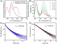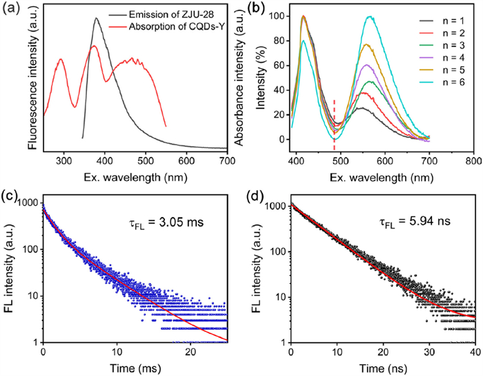 | Fig. 4. (a) Fluorescence emission spectra of ZJU-28 and absorption spectra of CQDs-Y. (b) Normalized fluorescence emission spectrum of CQDs-Y-n@ZJU-28 at 365 nm. Fluorescence decay curves fitting of (c) CQDS-Y-4@ZJU-28 and (d) CQDs-Y. | |