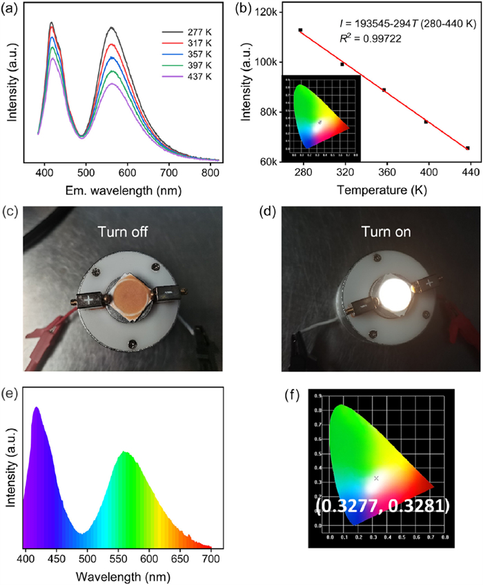 | Fig. 5. (a)Variable temperature fluorescence emission spectrum of CQDs-Y-4@ZJU-28 under 370 nm excitation. (b) Intensity fitting curve corresponding to the 546 nm peak of Fig. 5a and CIE coordinates (illustration). (c) The LED test of CQDs-Y-4@ZJU-28 powder assembled under daylight. (d) Luminous photograph of CQDs-Y-4@ZJU-28 powder excited at 365 nm. (e) Fluorescence spectra and (f) CIE coordinate under LED test. | |