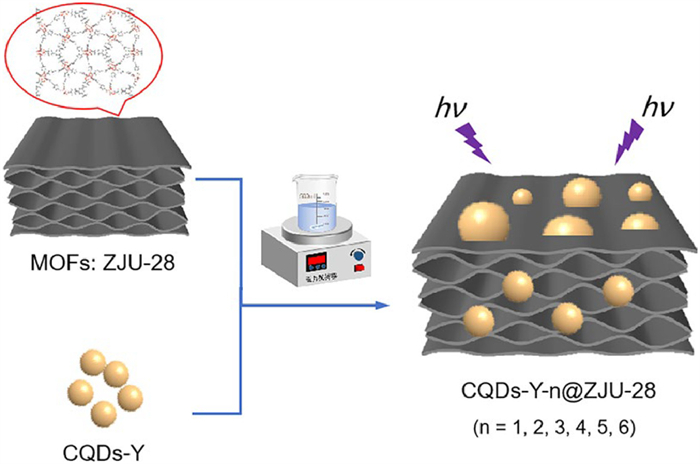 | Scheme 1. Schematic illustration of the synthesis of CQDs-Y-n@ZJU-28 composite using ZJU-28 and CQDs-Y. | |