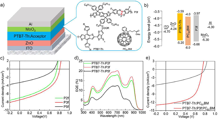 | Fig. 2. (a) Device structure, (b) energy level alignments, (c) J–V curves, and (d) EQE spectra of the all-PSC devices based on the PTB7-Th:P2f, PTB7-Th:P3f and PTB7-Th:P5f blends. (e) J–V curves for PTB7-Th:PC61BM, PTB7-Th:P3f:PC61BM. | |