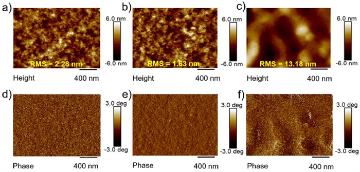 | Fig. 3. AFM height and phase images of PTB7-Th:P2f (a, d), PTB7-Th:P3f (b, e), and PTB7-Th:P5f (c, f). | |