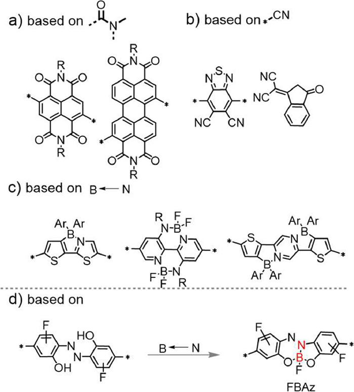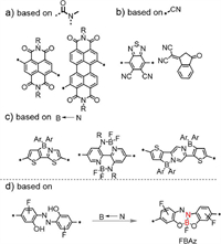| Scheme 1. Examples of electron-deficient building blocks based on amide, cyan, and B←N units (this work). | |