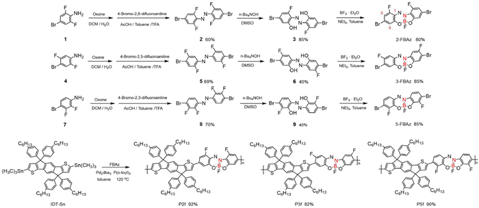 The molecular structures and synthetic routes of FBAz, P2f, P3f and P5f were shown in Scheme 2. The FBAz units was prepared in a three-step synthesis starting from commercially available fluorinated 4-bromoaniline. Firstly, we tried Mills reaction of compound 1 to afford azo compound 2 and subsequent nucleophilic aromatic substitution reaction (SNAr) with OH‒ as the nucleophile to afford ligand 3. The FBAz complexes were synthesized in high yields by the condensation reaction at 100 ℃ in toluene between the corresponding azobenzene tridentate ligands and boron trifluoride etherate (BF3·Et2O), respectively. FBAz complexes are highly stable in air, aqueous solution and could be purified by column chromatography on silica gel. The chemical structure of FBAz units were confirmed by 1H NMR and 13C NMR spectroscopy (Supporting information). Next, using the obtained FBAz complexes as monomers coupled with the electron-rich IDT tin reagent, three FBAz-IDT copolymers P2f, P3f and P5f were synthesized. The incorporation of an electron-rich moiety was expected to enhance the conjugation and extend the absorption spectrum, thereby reducing the band gap. All the three polymers exhibited good solubility in normal chlorinated aromatic solvents, such as chloroform (CF), chlorobenzene (CB) and o-dichlorobenzene (o-DCB). According to gel permeation chromatography (GPC) with THF as eluent, the number-average molecular weight (Mn) and polydispersity index (PDI) were estimated to be 60 kDa/2.75 for P2f, 55 kDa/4.23 for P3f and 75 kDa/4.14 for P5f. According to thermogravimetric analysis (TGA) under nitrogen atmosphere P2f, P3f and P5f all exhibited excellent thermal stability with the thermal decomposition temperatures (Td) at 5% weight loss higher than 390 ℃ (Supporting information).