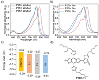 | Fig. 1. UV–vis absorption spectra of P2f, P3f and P5f in solution (a) and in films (b). (c) Schematic representation of the LUMO/HOMO energy level alignments of the polymer donor and the acceptors. (d) Chemical structure of PTB7-Th. | |