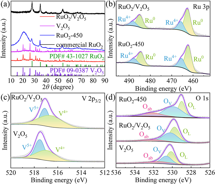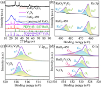 | Fig. 1. (a) XRD patterns of RuO2/V2O5, RuO2–450 and V2O5. (b) Ru 3p XPS spectra of RuO2/V2O5 and RuO2–450. (c) V 2p3/2 XPS spectra of V2O5 and RuO2/V2O5. (d) O 1s XPS spectra of RuO2–450, RuO2/V2O5 and V2O5. | |