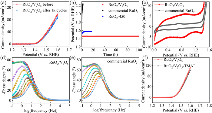 | Fig. 4. (a) Cyclic stability of RuO2/V2O5. Stability test (b), cyclic voltammetry curves (c) and bode plots (d, e) of commercial RuO2 and RuO2/V2O5. (f) OER performance of RuO2/V2O5 with and without TMA+. | |