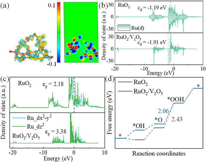 | Fig. 5. (a) Charge density of RuO2/V2O5. Density of state (b), eg filling (c) and OER energy barrier (d) of RuO2 and RuO2/V2O5. | |