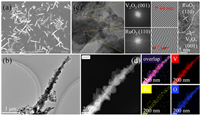 | Fig. 2. SEM (a), TEM (b), HR-TEM (c), HAADF-STEM (d) and relative EDS mapping of RuO2/V2O5. | |