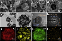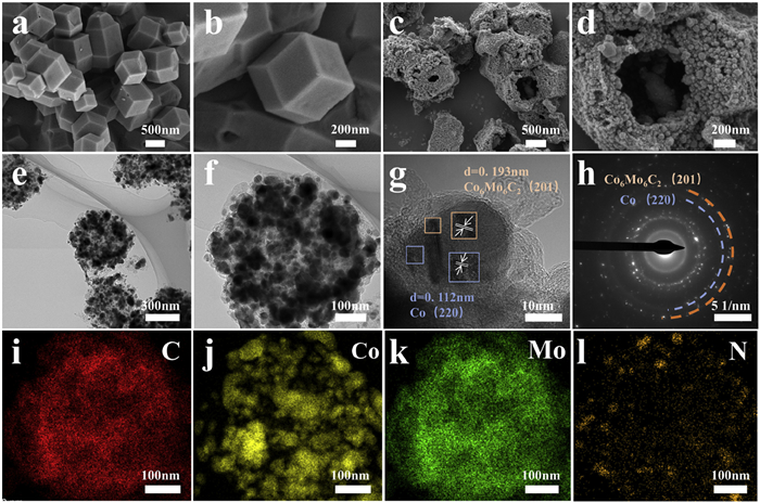 | Fig. 1. SEM images of (a, b) Co-ZIF-67, and (c, d) Co6Mo6C2@Co@NC. (e, f) TEM images of Co6Mo6C2@Co@NC. (g) HRTEM image of Co6Mo6C2@Co@NC. (h) SAED pattern of Co6Mo6C2@Co@NC. (i-l) Corresponding elemental mapping images of Co6Mo6C2@Co@NC. | |