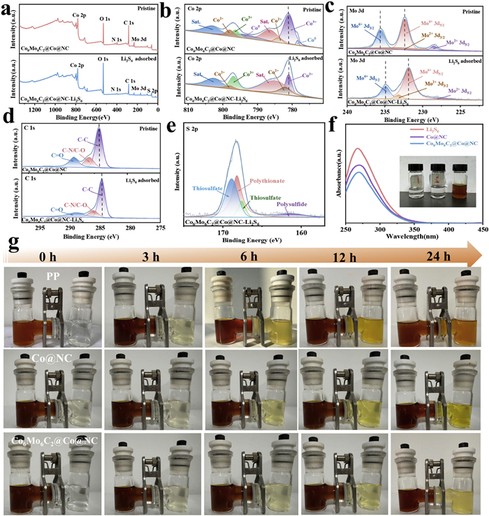 | Fig. 2. (a) The XPS of Co6Mo6C2@Co@NC before and after the adsorption of Li2S6. (b-d) Co 2p, Mo 3d, and C 1s XPS spectra before and after Li2S6 adsorption. (e) S 2p XPS spectra after Li2S6 adsorption. (f) UV–vis spectra and corresponding image (inset) of pure Li2S6 solution before and after adsorption of Li2S6 by modified materials. (g) Li2S6 permeation measurements of PP, Co@NC/PP and Co6Mo6C2@Co@NC/PP separators. | |