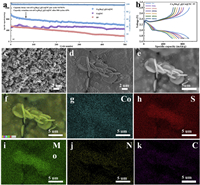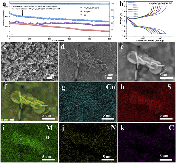 | Fig. 4. Electrochemical performance comparison of the batteries based on Co6Mo6C2@Co@NC/PP, Co@NC/PP and PP separators. (a) Cyclic performance at 1 C. (b) Discharge/charge potential profiles of Co6Mo6C2@Co@NC/PP modified separator at 1 C. (c) SEM image of the Co6Mo6C2@Co@NC/PP separator furface. (d-k) SEM of images and the corresponding elemental mapping images of C, N, S, Co and Mo elements of Co6Mo6C2@Co@NC/PP separator after 500 cycles at 1 C. | |