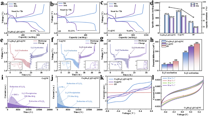 To detect the stabilizing performance of the modified separators and PP separator on the batteries, the modified material and PP batteries were operated for a self-discharge test after interruption of 72 h at 2.15 V. As illustrated in Figs. 5a-d, the capacity retention of Co6Mo6C2@Co@NC/PP batteries is up to 83.2%. However, the capacity retention of Co@NC/PP and PP batteries are 76.45% and 51.12%, respectively. The Co6Mo6C2 material enhances the LiPSs absorption and improves the self-discharge phenomenon. The batteries with modified material, and PP separators measured the internal resistances during charging and discharging at a current density of 0.1 C by GITT testing. The internal resistance of the battery with Co6Mo6C2@Co@NC/PP separator (ΔIR = 0.02946 V) is smaller than the batteries of Co@NC/PP (ΔIR = 0.0312 V) and PP separators, illustrating that the Co6Mo6C2@Co@NC/PP material promotes the transfer of Li+ (Figs. 5e-h). Besides, to further investigate the conversion of polysulfides by the modified materials of the separator, potentiostatic discharge plots were conducted at 2.05 V to measure the precipitation of Li2S to the electrode surfaces of modified material batteries. From Figs. 5i and j, The Co6Mo6C2@Co@NC/PP battery shows faster nucleation response time than that of Co@NC/PP battery. In addition, the Li2S precipitation capacity of the Co6Mo6C2@Co@NC/PP battery provides 373.16 mAh/g as compared to that of the Co@NC/PP battery (188.26 mAh/g). In summary, these results suggest that Co6Mo6C2 material strengthens the redox reaction of polysulfides, which contributes to the conversion of polysulfides into Li2S [56].