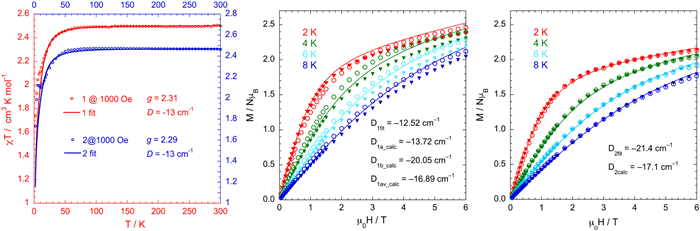 It should be mentioned that it is not possible to discriminate between negative and positive D values from the χMT data, however, which can be further confirmed by the magnetization (M) versus B plots (Fig. 2 middle and right for compounds 1 and 2 respectively). In order to quantify the magnitude of the ZFS parameter, we fitted the magnetic data using the spin Hamiltonian