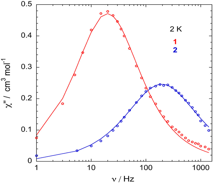 | Fig. 3. Frequency dependent out-of-phase and in-phase ac magnetic susceptibilities ((○) experimental data; (—) fit) at 2 K under an applied dc magnetic field of 1800 and 3000 Oe for compounds 1 and 2 respectively. | |