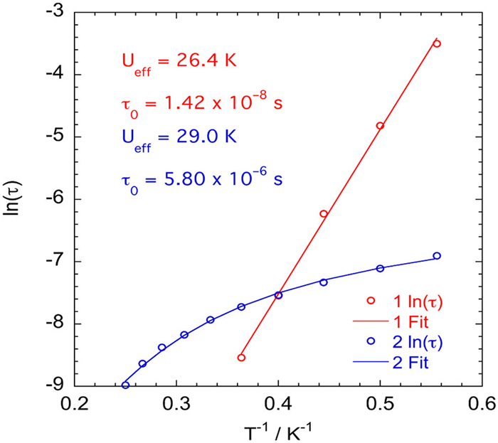 The effective energy barrier (Ueff) and relaxation time (τ, τ0 is the relaxation time at infinite temperature) can be obtained through fitting the plot of ln(τ) vs. 1/T (Fig. 5) of the high temperatures (Orbach regime) using Arrhenius equation ln(τ) = ln(τ0) + Ueff/kBT, which elicited a value of Ueff = 26.4 K and τ0 = 1.4 × 10–8 s for 1. In order to fit the whole curve for compound 2, which requires consideration of all relaxation process, we attempted to fit the dependence of the relaxation time using the following general expression: